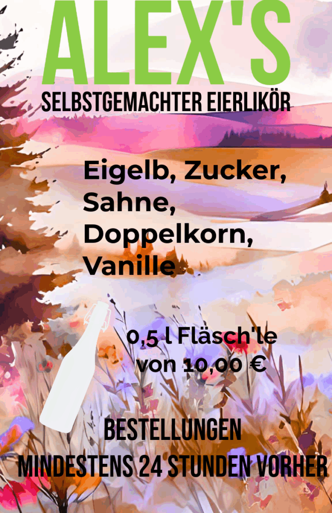 Probieren Sie Alex’s selbstgemachten Eierlikör, cremig-frisch aus der Sternen-Küche! Ob als Mitbringsel für zu Hause, als Geschenk für gute Freunde oder einfach zum Selbst-Genießen – Sie werden begeistert sein!